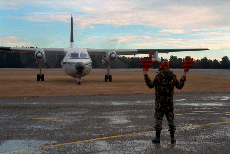 Airman marshaling Navigation, Air Electronics and Telecommunications Squadron Friendship NZ2781 with large novelty batons during Exercise Wise Owl 55 at Oamaru airport.
