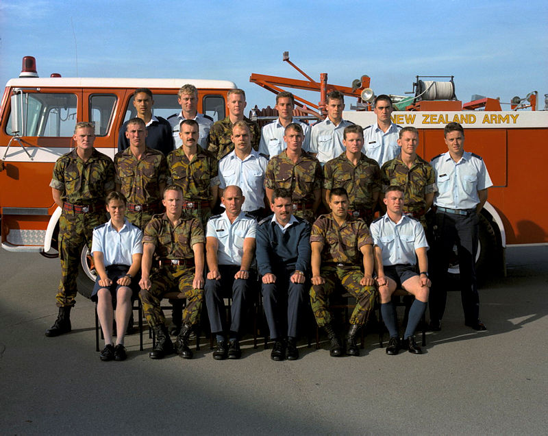 Group. No. 1/92 Primary Fireman course in front of an NZ Army International fire tender. No. 3 Technical Training School, RNZAF Base Wigram. L-R: Back; AT Campbell, CJ Leach, MG Bredenbeck (Army), DR Inwood, JD Patterson, TJL Wilson. Middle; GB Bell (Army), PA McKay (Army), RM Williams (Army), QP Giles, WS Bramley (Army), DG Clarke (Army), SP Hilleard (Army), BC Adlam. Front; MA Muir, MJ Long (Army), DG Maxwell (Instructor), T Cooney (Instructor), BL Ruruku (Army), JM Trevarton.